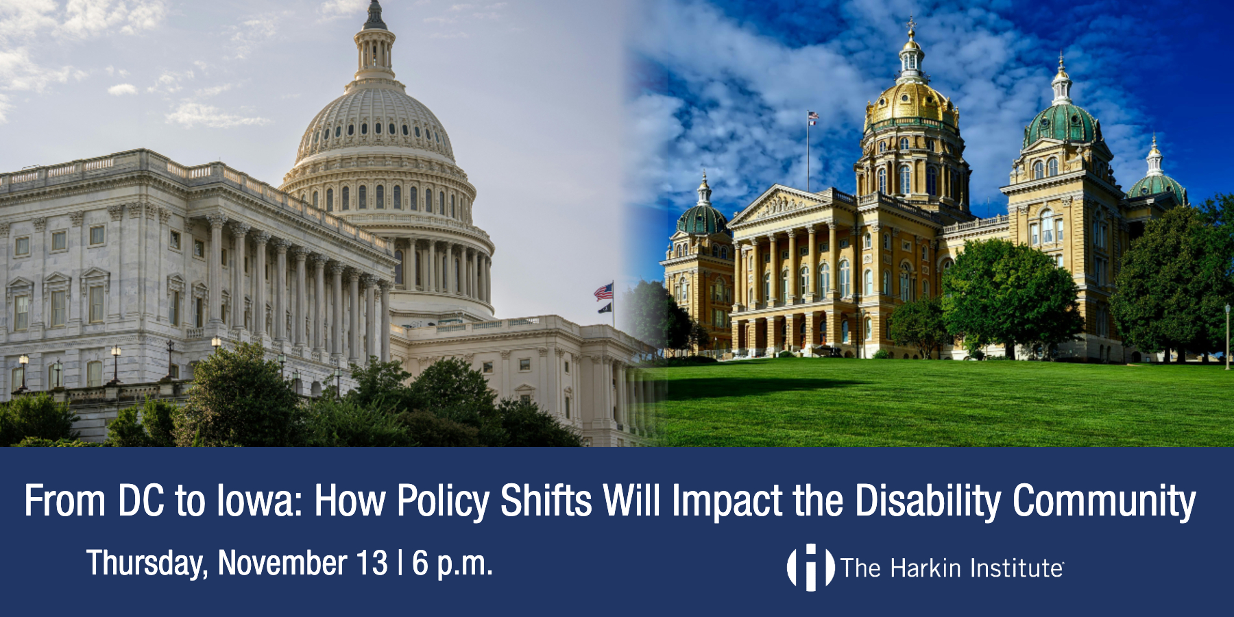 Join the Iowa Disability Policy Alliance for a panel discussion, resource fair, and networking reception at the Tom and Ruth Harkin Center on November 13, 2025. Panelists will discuss the state of disability legislation at the federal, state, and local levels. Members of the Iowa Disability Policy Alliance will have tables with information and resources before and after the event. Light refreshments will be provided.